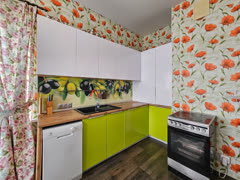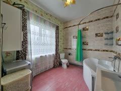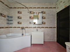 Совмещенный санузел оформлен с вниманием к деталям, а на полу и стенах качественная плитка, что обеспечивает лёгкость в уборке и комфорт.